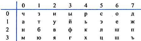 Еще раз обращаем ваше внимание на то, что буквы в таблице размещены произвольно, порядок нумерации строк и столбцов также может быть каким угодно. Поэтому можно придумать множество кодов, отображающих буквы выбранного алфавита 5-разрядной комбинацией цифр 0 и 1. Такую комбинацию будем называть, как и в коде Бэкона, двоичным кодовым словом. К примеру, букве "м" соответствует двоичное кодовое слово 11000.