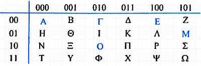 Передача каждой буквы у Клеоксена и Демоклита осуществлялась двумя 5-разрядными двоичными словами. Например, код слова ОМЕГА имел бы в этой системе вид: