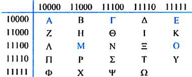 Допустим, нам надо передать слово ОМЕГА (так называется буква Q греческого алфавита). Каждой последовательно "зажигаемой" букве будет соответствовать определенная 5-разрядная двоичная комбинация: