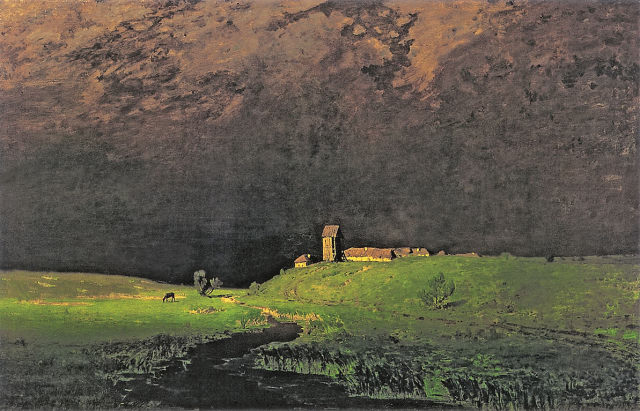 В одном из самых ярких романтических пейзажей Куинджи все проникнуто ощущением грандиозности и волнующей красоты мироздания. Бездонное грозовое небо раскинулось над освещенным последними солнечными лучами ярко-зеленым лугом. Извилистая полоса реки придает пейзажу стройную симметричность и направляет взгляд вглубь, туда, где скоро засверкает молния – предвестница страшной грозы.