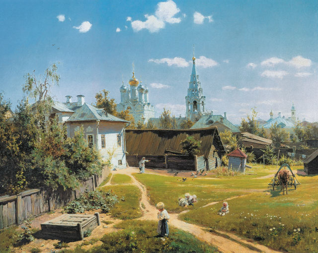 Этот пленительный вид старой Москвы написан Поленовым на Арбате. Дом, изображенный слева, – тот же, что и в пейзаже «Бабушкин сад». Церковь св. Николая на Песках сохранилась до нашего времени. Поленов слегка «раздвигает» небольшое пространство дворика, чтобы придать ему обобщенный образ уютного старинного городка. Все здесь наполнено лучезарным солнцем, которое вспыхивает в позолоченных куполах церкви и колокольни, ярко освещает стены домов и сараев, «золотит» макушку мальчугана, играющего на лужайке. «Московский дворик» замечателен пленэрной живописью, которая была редкостью в русском искусстве этого времени: тень на заборе окрашивается сиреневосеребристым цветом, разноцветные блики играют в зелени травы. Картина отразила важные черты русского национального самосознания: мечту о тихой усадебной жизни.