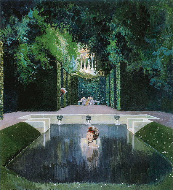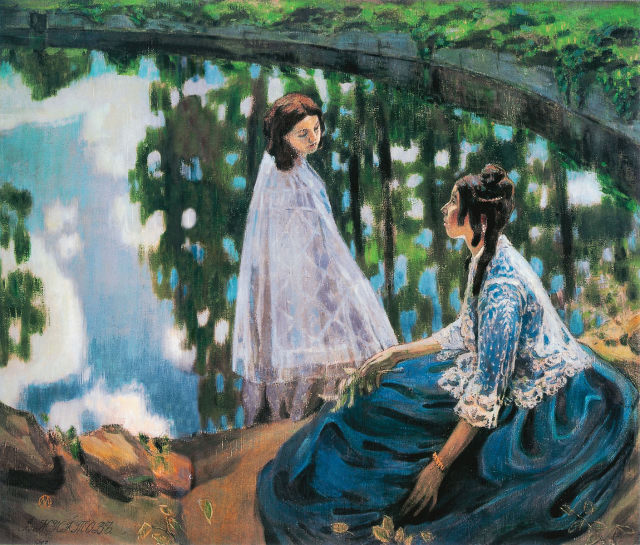 «Водоем» – это тихая элегия, грустная и прекрасная греза о былом. Печальные женщины словно сошли со старинных гобеленов. Одна из них сидит на берегу пруда, и ее юбка «растеклась» складками, подобно кругам на воде. Другая прогуливается вдоль водоема, погруженная в созерцательную тишину, и ее струящаяся шаль тоже вторит водяным струям.
