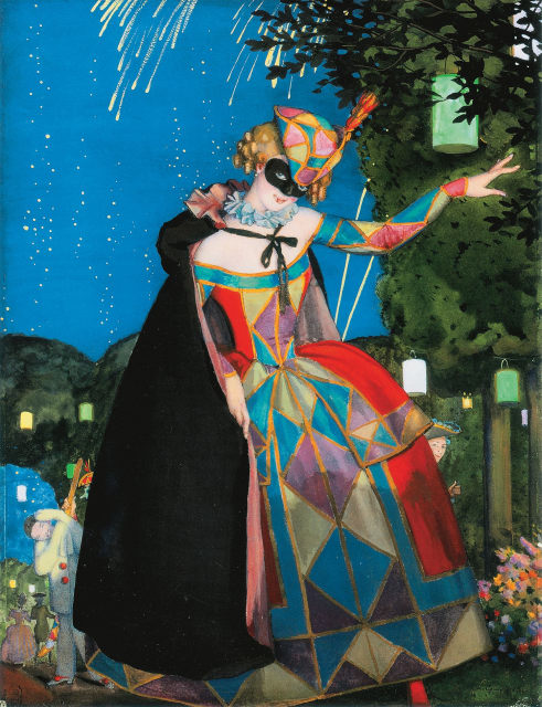 По складу дарования Сомов прежде всего график. Из фигур и элементов фона он слагает изысканный ритмический узор, раскрашивая его в декоративно насыщенные тона яркого южного лета и веселых комедийных масок.