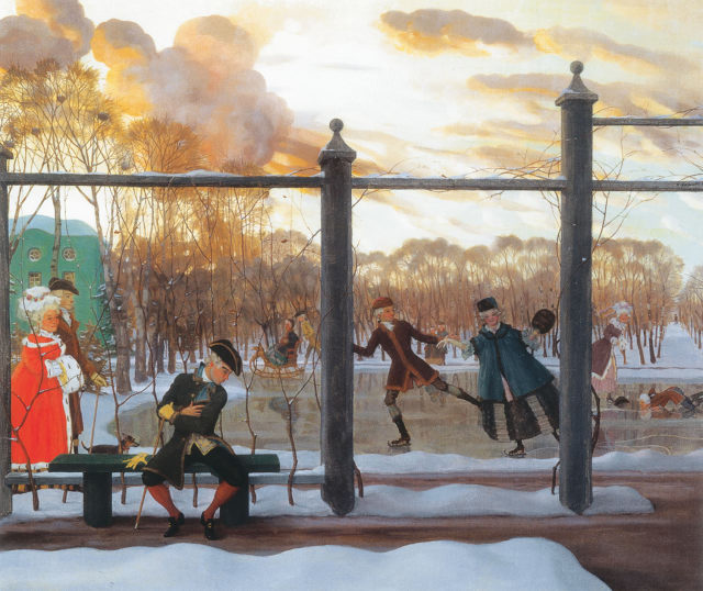 В этой работе замечательно соединяются живое чувство природы – холодное северное небо с розовеющими от вечернего заката облаками, прозрачное кружево деревьев – и тонкая стилизация старинной сцены на катке. Особую занимательность картине придают юмористические подробности: кавалер в парике неловко растянулся на льду; дама на коньках катается с муфтой в одной руке, а другой рукой кокетливо держится за своего спутника.
