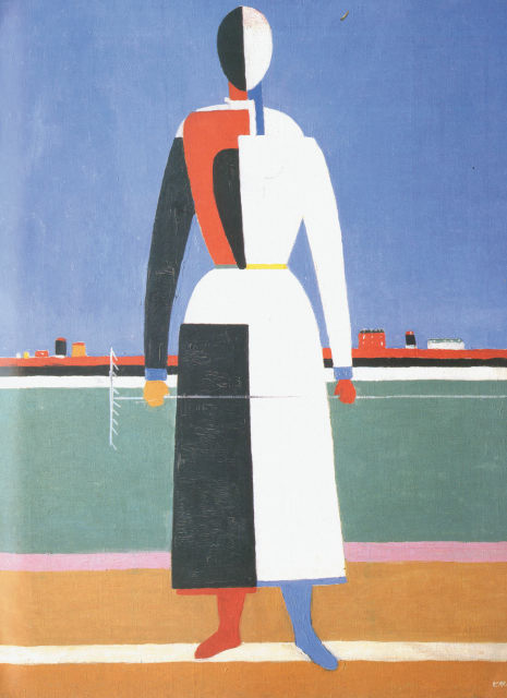 Фигура женщины составлена из разноцветных супрематических фигур. Точно так же сконструирован пейзажный фон. Малевич создает некую ритмическую систему организации плоскости, в которой отдельные формы и цвета уравновешивают
