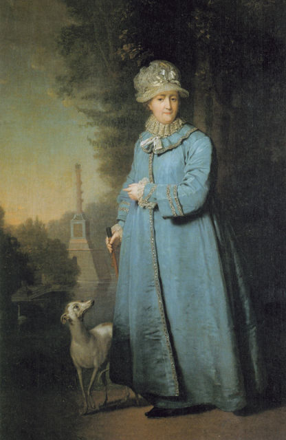 Боровиковский писал императрицу за год до ее смерти. Екатерина II изображена без регалий – как обычная помещица в чепце и утреннем капоте, гуляющая по парку с тонконогой белой собачкой. Только обелиск на заднем плане свидетельствует, что перед нами значительная особа. Обелиск – это памятник в честь побед русского флота, установленный посреди Большого
