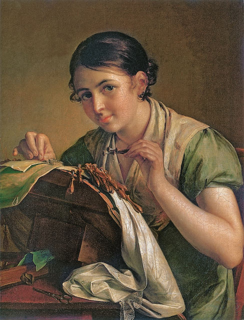 Перед нами не портрет конкретной девушки, а собирательный поэтический образ мастерицы, каких Тропинин мог встречать в домах знатных москвичей. Художник не изображает того тяжелого, что было в ее сложном и кропотливом труде, он любуется и восхищается прелестью и красотой молодости. П. Свиньин писал об этой картине, что она «обнаруживает чистую, невинную душу красавицы и тот взгляд любопытства, который брошен ею на кого-то, вошедшего в ту минуту: обнаженные за локоть руки ее остановились вместе с взором, вылетел вздох из девственной груди, покрытой кисейным платочком».