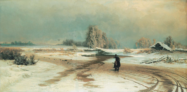 Над бескрайними просторами сырой седой равнины клубятся темные облака, качаются от ветра величавые, еще погруженные в зимний сон деревья-исполины. По сравнению с огромным пространством земли и неба фигуры мужчины и ребенка кажутся чрезвычайно маленькими, затерянными среди этого холодного, бесконечного, но величественно-прекрасного мира. И все же чувствуется, как по этой унылой равнине проносится мягкое дуновение весны. Между заснеженными берегами проглядывает темная вода освободившейся ото льда реки, появились первые проталины на дороге, а ребенок радостно указывает