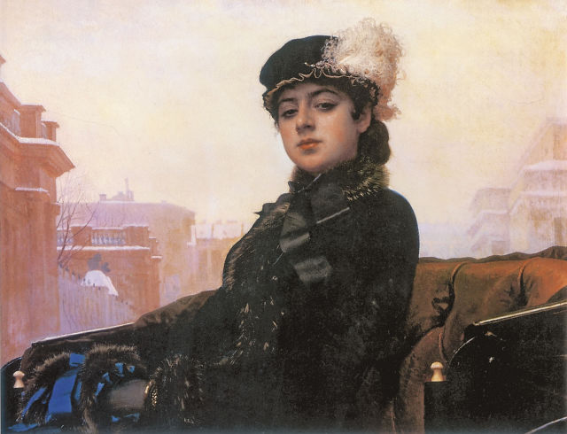 Современники просили художника раскрыть секрет, кого он изобразил на портрете. Критик В. Стасов громогласно назвал героиню «кокоткой в коляске». В частном собрании в Праге хранится живописный этюд к этому портрету, где женщина не так эффектна и красива, а чувство опустошенности и надменности на ее лице обозначено более ясно. Несомненно, Крамской дал собирательный образ, некий тип, характерный для этого времени. Неизвестная красавица одета по последней парижской моде: на ней шляпа «Франциск», перчатки из тончайшей кожи, бархатное пальто «Скобелев» с соболиным мехом, на руке сверкают золотые браслеты. В высшем обществе было принято слегка отставать от моды, поэтому можно предположить, что перед нами дама «полусвета» – актриса или богатая содержанка. Во времена Крамского этот образ называли «эмансипистка» за надменный, вызывающий взгляд женщины, за дистанцию, которую она смело удерживает со зрителем.