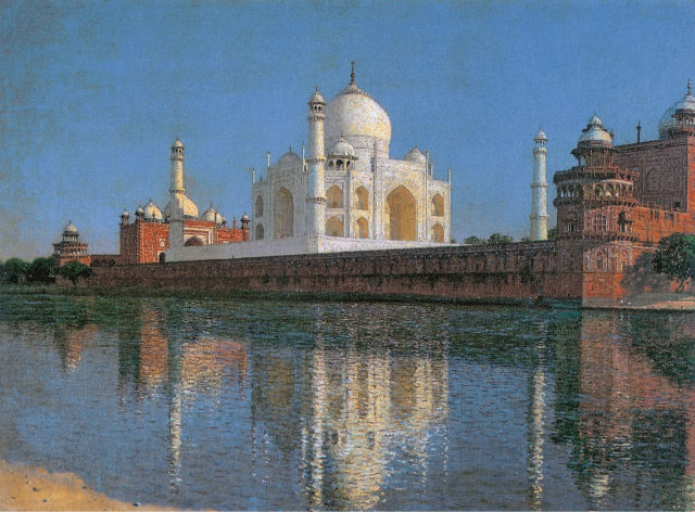 Из индийского путешествия 1874–1876 годов Верещагин привез около 50 этюдов. Его поразила яркая экзотическая культура Индии. Этюд, изображающий знаменитый Тадж-Махал в Агре, выглядит как законченная картина. Художник выбирает ракурс, который наиболее полно демонстрирует великолепие архитектурного ансамбля. Классическая ясность пропорций мавзолея подчеркивается его мерцающим отражением в серебристо-голубой воде, смягчающим аккорд ярких, насыщенных красок ослепительно-белого здания.