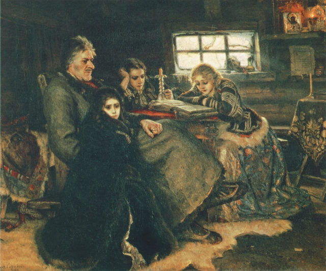 А. Д. Меншиков, сподвижник Петра I, генералиссимус, один из богатейших людей этого времени, в годы правления Петра II был отстранен от власти, лишен имущества и отправлен с семьей в ссылку в далекий сибирский город Березов. Его жена умерла в пути. На картине перед нами интерьер тесной, холодной избы. Сквозь маленькое заиндевевшее окошко едва проглядывает свет морозного дня. Вокруг стола, тесно прижавшись друг к другу, сидят Меншиков и его дети. Каждый из них размышляет о былом, грезит о будущем… Фигура Меншикова, по выражению Крамского, подобна «орлу в клетке». Суриков сознательно нарушил пропорции, увеличив ее масштаб, давая зрителю почувствовать нерастраченные силы этого «полудержавного властелина» (А. Пушкин). Золотой перстень на пальце и драгоценный подсвечник на столе – вот все, что осталось ему от былого богатства.