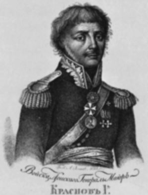 …Во время Кинбурнского сражения 1 октября 1787 года поручик Иван Краснов 1-й послан был Суворовым к пехотному батальону с приказом ударить на янычар в штыки. Офицер сам возглавил штыковую атаку, заменив убитого командира (из строя батальона в том деле убыли все офицеры). В бою «при сильнейшем огне» он получил пулевое ранение в правую ногу почти одновременно с генералом Суворовым, и они лечились «в одной ставке». За Кинбурнскую викторию донец Краснов получил звание армейского капитана.
