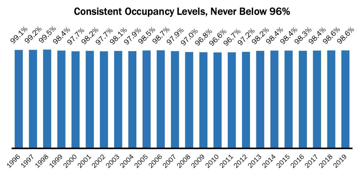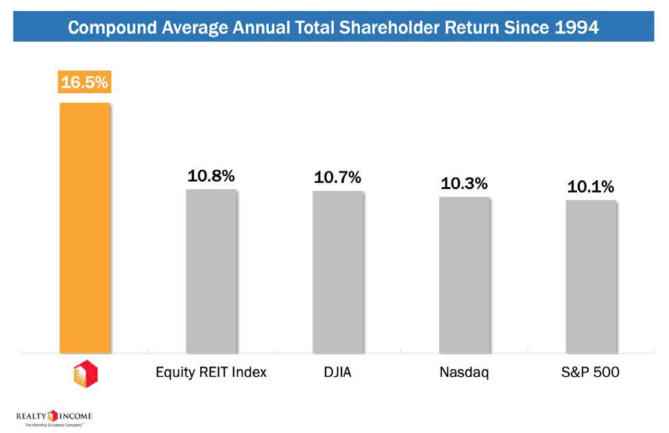 Realty Income – не курица, несущая золотые яйца, однако выплачивает своим акционерам солидные 3,5% в годовом исчислении. Такая инвестиция не отличается выдающейся доходностью, но достаточно безопасна. 23 из последних 24 лет компания демонстрировала рост положительной прибыли в пересчете на акцию, что является впечатляющим достижением для бизнеса, который 83% своего дохода за счет аренды получает в пугающей многих розничной индустрии. Фирма добилась этого за счет сохранения в своих объектах только высококачественных и разнообразных арендаторов. По состоянию на конец прошлого года уровень заполняемости составлял 98,6%. Это не ускользнуло от внимания акционеров, которые начали гнать цену акций компании вверх, чем помогли фирме достичь совокупной годовой доходности в 16,5% за период с 1994 года. За тот же промежуток времени индекс инвестиционных фондов Equity REIT рос, в среднем, всего на 10,8% в год. ,