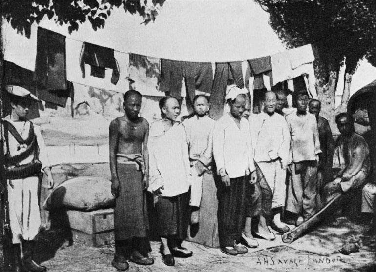 Так как по их понятиям китайцы были не полноправные люди, а варвары и кули, т. е. чернорабочие, то с ними поступали как с рабами. Для исполнения всяких черных и тяжелых работ союзники устраивали особого рода охоту или ловлю китайцев. Отряжали команду солдат, которым было приказано наловить китайцев для работы. Солдаты отправлялись и забирали в городе всякого китайца, который имел несчастье попасть им навстречу. Солдаты не спрашивали, желает ли и может ли китаец работать или нет, а забирали столько человек, сколько было приказано. За работу им только давали рис. За побег или малейшие признаки неповиновения или неудовольствия били палками. Так как летом все китайцы обыкновенно одеваются более или менее одинаково в простые бумажные синие костюмы, то солдаты, конечно, захватывали китайцев без всякого разбора: в одну кучу ловили и рабочих и торговцев, ремесленников, учеников школ, стариков, взрослых и мальчиков, семьи которых с отчаяньем ждали возвращения своих пропавших без вести сыновей, мужей и отцов. Союзники не спрашивали о том, что станется с мирной и порядочной семьей, у которой вдруг отрывали принадлежавших ей мужчин, они только требовали, чтобы было доставлено такое-то число кули, и очень удивлялись, что русские платили не только рисом, но и деньгами работавшим у них манзам.