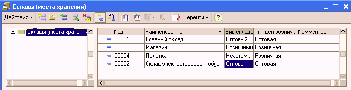 В справочник «Склады (места хранения)» может быть введено любое количество складов. Информация хотя бы об одном складе должна присутствовать обязательно.