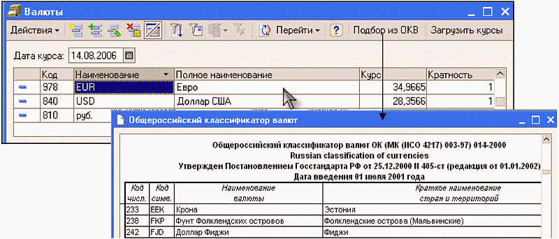 При этом открывается общероссийский классификатор валют в виде текстового файла, в котором можно найти, выбрать и занести новую валюту в справочник валют.