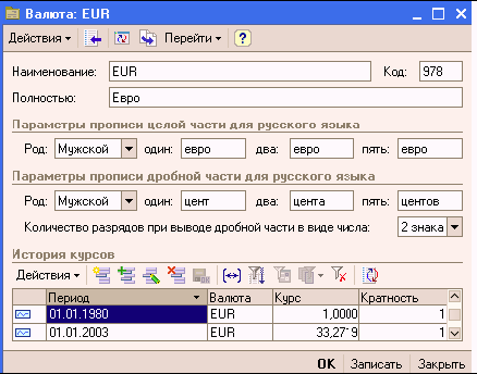 Реквизиты «Курс» и «Кратность» взаимосвязаны, смысл их использования следующий. Если кратность задана равной единице, то в поле «Курс» вводится количество рублей, соответствующее единице данной валюты (то есть, курс валюты – в привычном понимании). Если курс данной валюты по отношению к рублю очень низкий (точность составляет меньше 4 знаков дробной части), в поле «Кратность» следует указать количество единиц валюты, принятое к котированию (котировочная единица валюты), а в поле «Курс» – сумму в рублях, соответствующую этому количеству единиц валюты.