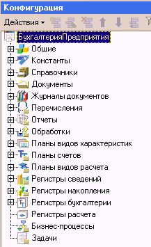 В верхней части в виде дерева выдается список элементов встроенного языка системы «1С: Предприятие»: операторов, управляющих конструкций, процедур и функций, системных констант и др. Для удобства все элементы встроенного языка объединены в тематические разделы, представленные в виде ветвей дерева.