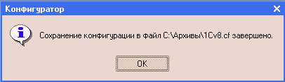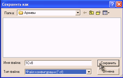 Так как конфигурация расположена внутри ИБ, то Конфигуратор позволяет извлечь ее из ИБ в файл, который может располагаться где угодно. Файл конфигурации используется для переноса конфигурации на другое рабочее место, для создания временного архива и т.д. Для этого необходимо вызвать команду меню «Конфигурация – Конфигурация базы данных – Сохранить конфигурацию БД в файл…». В открывшемся диалоговом окне нужно указать место сохранения файла конфигурации (файл сохраняется с расширением «*.cf»):