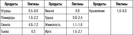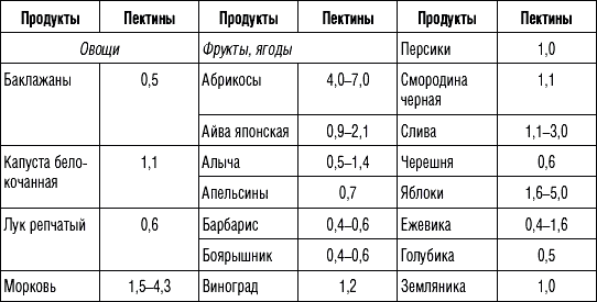 Очень полезно принимать в пищу продукты, содержащие пектин, которые способны выводить из организма токсичные и отработанные вещества. Пектин в основном концентрируется в сердцевине фруктов и в их кожуре, в цитрусовых весь пектин содержится в цедре. В незрелых фруктах и овощах пектина содержится больше, чем в спелых, поэтому полезно при приготовлении варенья и джемов помимо спелых плодов использовать и недозрелые. Пектин служит натуральным загустителем для мармеладов, зефиров, пастилы, некоторых восточных сладостей (обычно это яблочный пектин). Для консервированных продуктов используют цитрусовый пектин. Пектин есть в йогуртах, натуральных соках с мякотью, пектины нередко добавляют в кетчуп и майонез для густоты (нужно только следить, чтобы пектин не был заменен на ароматизатор или искусственный загуститель, – это должно быть указано на упаковках продуктов). Выпускается также сухой, порошкообразный свекольный и яблочный пектин (до 25 % чистого пектина). Суточная норма пектина для взрослого человека – 4-15 г.