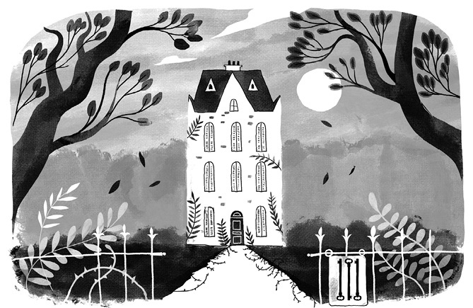 Мы добежали до железных ворот, которые вели в сад. В глубине виднелось большое строение в три этажа с множеством окон, тот самый дом дяди Эсташа. Я и забыл, что он такой высокий, почти замок! Мой внутренний исследователь подпрыгнул от радости. Изрядная часть фасада скрывалась за диким виноградом. Ко входу надо было пробираться через высокую траву и заросли ежевики. Можно подумать, природа захватила это место и обороняется от возможных захватчиков.