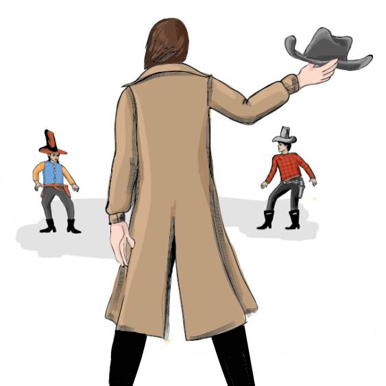 Буквально эта фраза означает «как только будет брошена шляпа». На Диком Западе брошенная шляпа служила сигналом к началу поединка. Сегодня эта идиома приобрела более широкий смысл и означает «без промедления», «тотчас», «сразу же» или указывает на беспричинность действия – «по малейшему поводу», «из-за любого пустяка». Например: “She cries at the drop of a hat.” – «Чуть что – она в слезы».