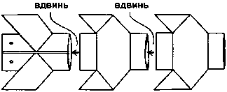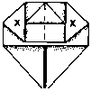 Теперь переверни всю фигуру другой стороной кверху — там тоже квадратик со щелкой посредине. Сделай и с этой стороны все, что ты делал на первой стороне. У тебя теперь фигура из четырех створок. Сложи две створки так, чтобы треугольнички х и х совпали; так же сложи и две другие створки.