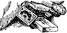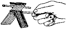 Возьми крышку от спичечного коробка и пропусти крепкую нитку через ее узкие боковые стенки; концы нитки свяжи. Нитка должна быть раз в шесть длинней коробка.