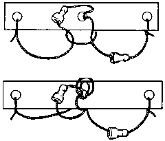 — Очень просто. Смотрите: прежде всего я оттягиваю немножко среднюю петельку и пропускаю в нее один ролик. Теперь я берусь у самой средней дырочки за две веревочки сразу и тяну, пока не протянется у меня на эту сторону вся петля.