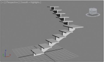 Инструмент Spiral Stair (Спиральная лестница) позволяет создавать спиральные по форме лестницы. Параметры лестницы практически совпадают с параметрами предыдущей лестницы, но в свитке Parameters (Параметры) присутствует опция Center Pole (Центральный столб), позволяющая добавить опорный столб в центре лестницы, а также отдельный свиток Center Pole (Центральный столб), параметры которого позволяют редактировать радиус ( Radius ) и сегментацию ( Segments ) это-го элемента.