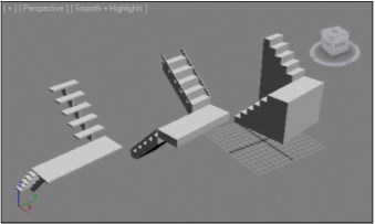 Параметры данного объекта разделены на четыре свитка: Parameters (Параметры), Carriage (Несущая часть), Railings (Перила), Stringers (Продольные опоры). Параметры свитка Parameters (Параметры) отвечают за общий внешний вид и ха-рактеристики лестницы.