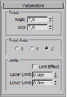 7. Далее необходимо закрутить форму этой перегородки. Выделите этот объект, во втором разделе командной панели раскройте список модификаторов и выберите пункт Twist (Скручивать). Данный модификатор позволяет скручивать форму любого объекта. После его применения в области параметров появился свиток Parameters (Параметры), который содержит все необходимое для настройки скручивания объекта (рис. 2.65).