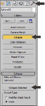 3. Теперь необходимо объединить эти модели в одну. Это можно сделать как при помощи булевой операции сложения, так и при помощи операции Collapse (Свернуть). Используем второй метод, как более подходящий в данной ситуа-ции. Выделите обе полусферы вместе, затем перейдите в последний раздел ко-мандной панели — Utilities (Утилиты), нажмите здесь кнопку Collapse (Свер-нуть) и далее — Collapse Selected (Свернуть выделенное) — рис. 2.117. В результате оба объекта стали единой формой.