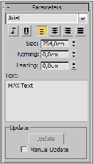 ? Text (Текст) — линия в форме любого текста. Создается в одно действие, поме-щая в сцену надпись "MAX Text". В дальнейшем надпись можно изменить, а также изменить шрифт, размер, наклон и прочие характеристики при помощи параметров объекта (рис. 3.3).