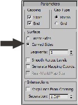 8. Форму получившейся модели можно сгладить. Для этого обратимся к парамет-рам первого свитка — Parameters (Параметры). Здесь, в группе Surface (По-верхность), необходимо переключить режим сглаживания на Curved Sides (Сто-роны кривыми) — рис. 3.60. Это позволит описывать формы сторон при помощи кривых линий.