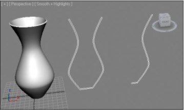 Суть данного метода заключается в следующем: сначала создается сплайн, форма которого совпадает с одной зеркальной половинкой вертикального сечения буду-щего объекта. Затем, при помощи специального модификатора, происходит враще-ние данного сплайна и превращение его в модель. Для наилучшего иллюстрирова-ния метода на рис. 3.62 показан объект, форма которого получена методом враще-ния профиля, его вертикальное сечение и зеркальная половинка этого