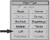 2. Выделите созданный сплайн - дугу, затем в первом разделе командной панели ( Create ), в первом подразделе Geometry (Геометрия), раскройте список типов объектов и выберите пункт Compound Objects (Составные объекты) — см. рис. 2.53. Здесь нам понадобится инструмент создания лофт - модели (рис. 3.76). (Если инструмент неактивен, значит, вы не выделили сплайн - дугу в сцене.)