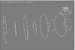 2. Теперь необходимо скопировать получившиеся окружности и распределить их в пространстве. В окне проекций Front (Вид спереди) расположите окружности так, чтобы более крупная была левее более маленькой. Затем выделите обе окружности продублируйте их вправо при помощи движения (<Shift> + манипулятор движе-ния). Количество копий задайте примерно 8, а тип копий — Copy (Автономная ко-пия). В результате должно получиться примерно то, что показано на рис. 3.107.