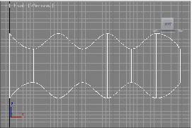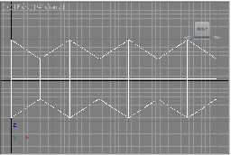 4. В результате получился единый сплайн, форма которого состоит из ряда окруж-ностей. Выделите данный сплайн и примените в отношении него модификатор CrossSection (Поперечное сечение). В результате появились ломаные продоль-ные линии, соединяющие отдельные вершины. На рис. 3.108 показана проекция вида спереди получившегося объекта.