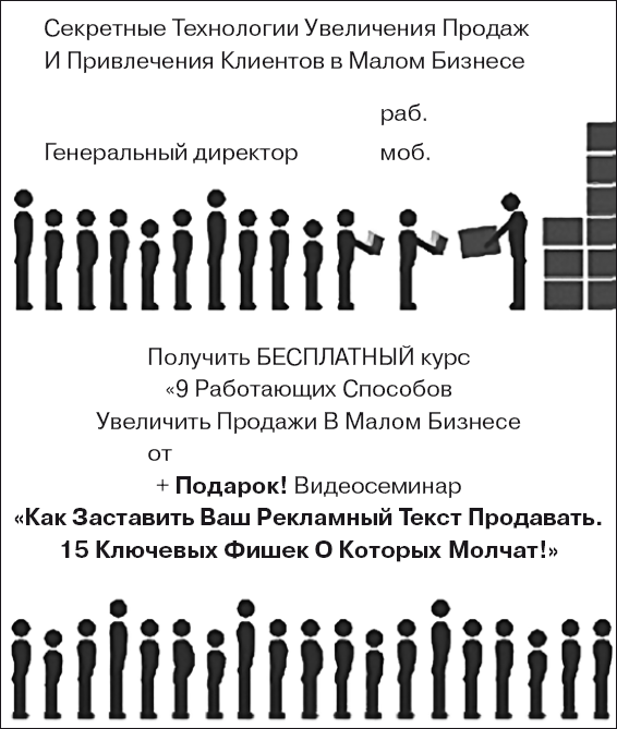 Чтобы собрать как можно больше контактов, необходимо предложить людям какой-то бесплатный front-end-продукт: консультации, диски, мини-книги. В некоторых случаях подойдет даже бесплатный бокал вина в обмен на визитку (мы видели и такие варианты в действии).