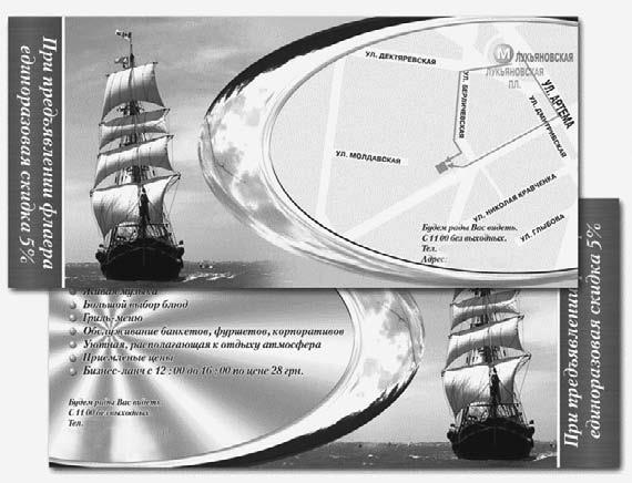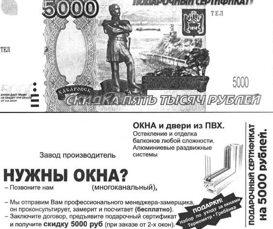 Далее мы приводим интересный вариант рекламы из сферы оконного бизнеса: с одной стороны флаера изображена купюра достоинством в 5000 рублей, с другой – подарочный сертификат на эту же сумму. Клиент начинает представлять, что 5000 рублей уже лежат у него в кармане. Скорее всего, при выборе окон он обратится именно в эту фирму (рис. 22).