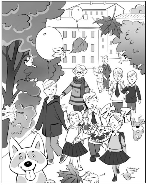 Мы нарядные с утра,Ранцы за плечами,Повзрослела детвора —Ты не бойся, мама!Будем в школе изучатьРазные науки,Будем быстро отвечать,Все поднимем руки!В этот день и в этот часМы шагаем в первый класс!Мы летим, как птицы,Мы хотим учиться!