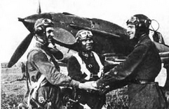 Батальонный комиссар Я. М. Басовин (справа) поздравляет летчиков капитана М. В Тикунова (в центре) с третьими сбитым и старшего лейтенанта Г А. Григорьева (слева) с десятым сбитым самолетом противника. Московская зона ПВО, лето 1942 г, 178-й или (6 ИАК ПВО). ЛаГГ-3, представленный на фото, из ранних выпусков (до 7-й серии).