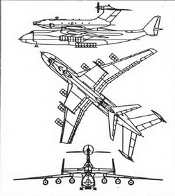 СИЛОВАЯ УСТАНОВКА состоит из двух стартовых турбореактивных двухконтурных двигателей IIK-8-4K и маршевого турбовинтового I1K-I2MK. Все двигатели представляют собой морские модификации соответствующих авиационных. Стартовые двигатели (статическая максимальная тяга одного в стандартных условиях 10, 5 т) установлены по бортам в отворачиваемой части фюзеляжа. Воздухозаборники размещены перед фонарем кабины пилотов для предотвращения попадания брызг и пыли при движении над морем или сушей. Поворотные сопла двигателей позволяют направить реактивную струю под крыло (режим поддува) или над крылом (если необходимо увеличение тяги в крейсерском полете). Маршевый двигатель приводит во вращение два соосных винта диаметром 6 м (статическая максимальная тяга в стандартных условиях 15. 5 т). На боргу также имеется вспомогательная силовая установка ТА-6А. Топливные баки расположены в корневых частях крыла.