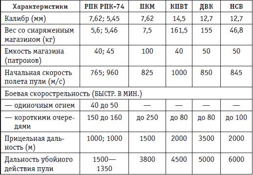 В отдельных случаях для увеличения огневой мощи стрелковых подразделений им придавались крупнокалиберные пулеметы КПВТ, ДШК и НСВ, которые были способны поражать открытого и расположенного в укрытиях легкого типа противника на дальностях до 2000 м. Более детально тактико-технические характеристики пулеметов представлены в таблице.