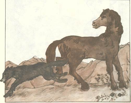 Великий Шакал врезался в табун, бросился на жеребца… Но ведь конь — не овца, и табун — не стадо. Большой жеребец стукнул Великого Шакала по зубам очень твёрдым копытом, а другие кони тоже стукнули и тоже копытами…