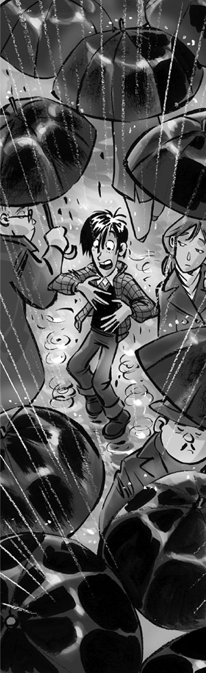 Ливень застал его врасплох. Сначала юноша попытался укрыться под навесом магазина, надеясь, что дождь вот-вот прекратится. Но он только усиливался, а времени у Ларри не было ни секунды. Он припустил бегом, останавливаясь лишь перед светофорами на оживлённых перекрёстках. Бедняга вымок с головы до пят.