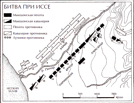 а – кавалерия Набарзана; б – легкая пехота; в – лучники; г – греческие наемники; д – личная гвардия Дария; е – азиатские вассалы; ж – резерв.