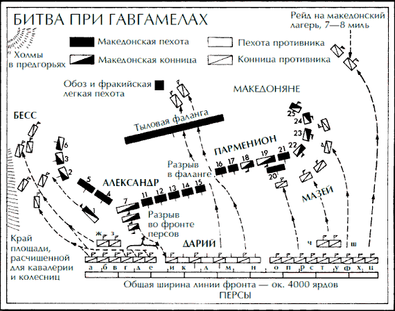 Поистине Александр превратил нужду в добродетель. Благодаря своей гениальной интуиции он создал план тактики, которая много веков спустя была использована лордом Мальборо при Бленхейме и Наполеоном при Аустерлице, но никем до македонского царя. Чтобы уменьшить значение численного превосходства противника и создать брешь для своего решающего удара, Александр решил отвлечь из центра побольше персидской кавалерии, спровоцировав столкновение на флангах, чтобы потом нанести удар по ослабленному центру противника.