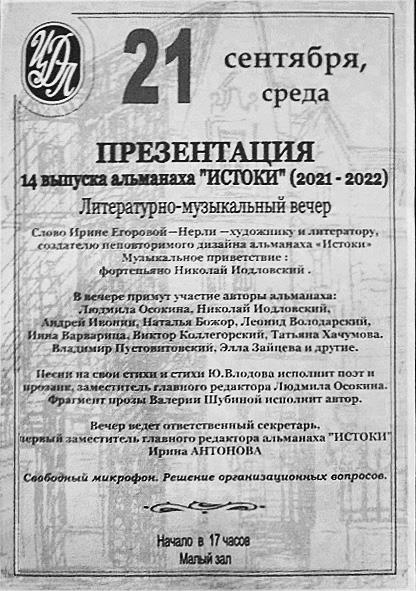 Вечер открыл музыкальной импровизацией на рояле Николай Иодловский. Затем выступила художник-оформитель «Истоков», член редколлегии Ирина Егорова-Нерли. В номере у неё эссе о Максимилиане Волошине, приуроченное к памятной дате, как раз об этом Ирина и рассказала. Затем выступили давние авторы «Истоков» Владимир Пустовитовский, Наталья Божор, Инна Варварица, Нина Трегубова, а также литературовед Алла Шарапова.
